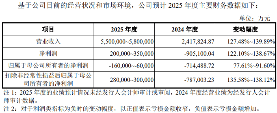 根据公司测算,2025年全年预计实现营业收入550.0亿元至580.0亿元,较2024年增长127.5%至139.9%。