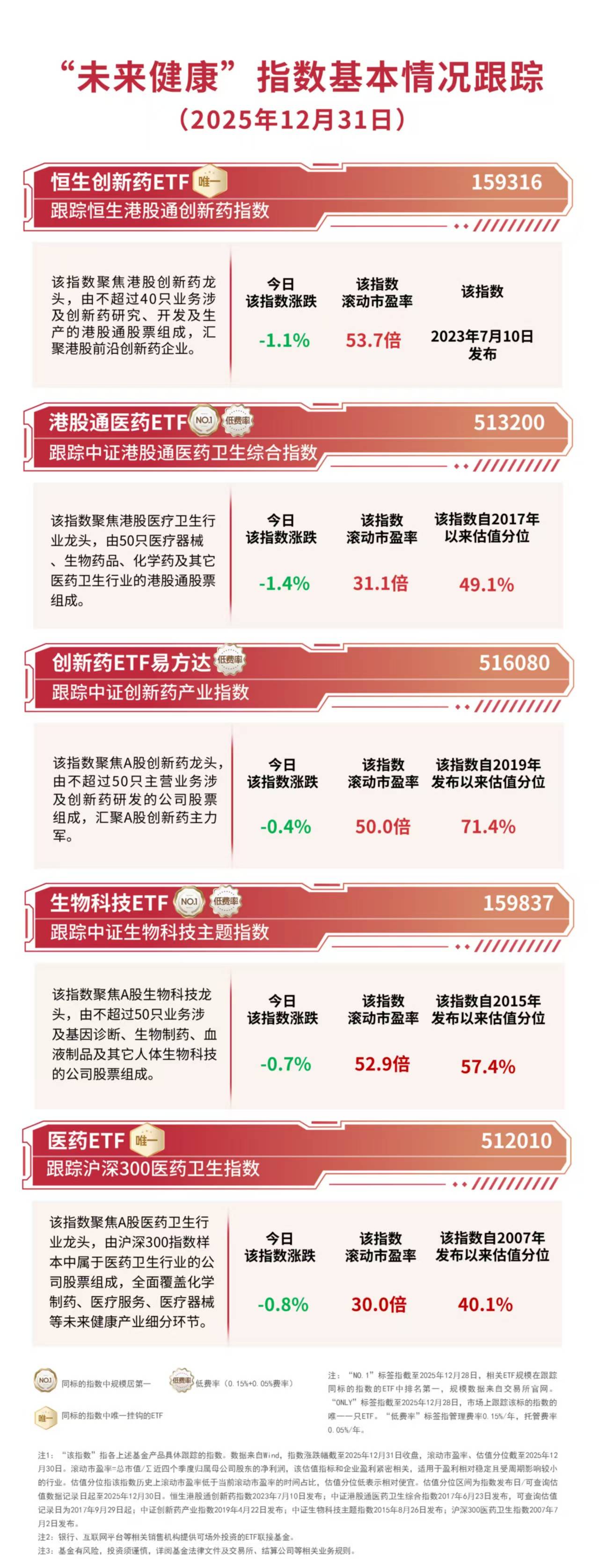 12月31日,2025年最后一个交易日,中证创新药产业指数下跌0.4%,中证生物科技主题指数下跌0.7%,沪深300医药卫生指数下跌0.8%,恒生港股通创新药指数下跌1.1%,中证港股通医药卫生综合指数下跌1.4%。回顾2025年,港股创新药板块表现亮眼,恒生港股通创新药指数累计涨幅超64%,相关ETF中,恒生创新药ETF(159316)最新规模超40亿元。