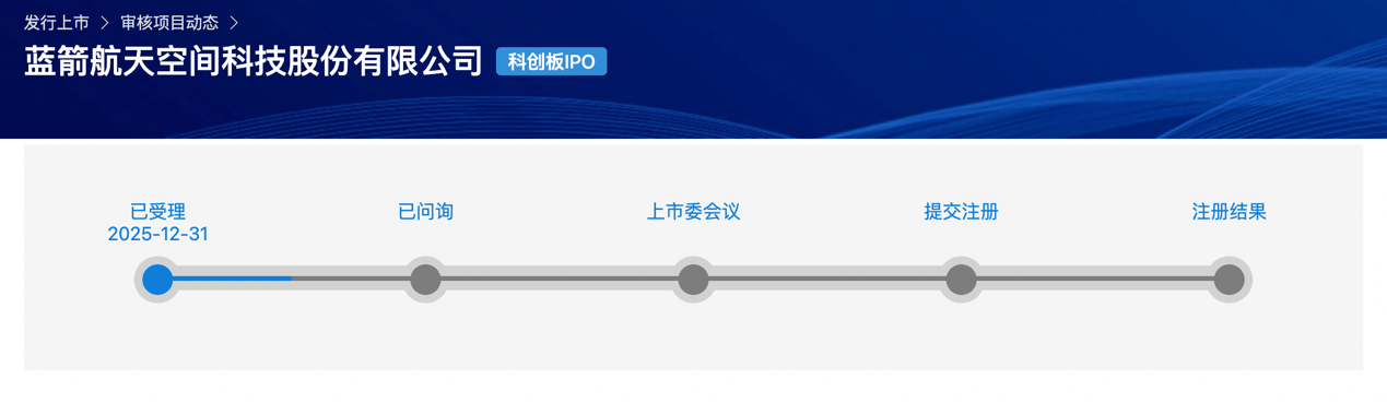 12月31日,上交所官网显示,蓝箭航天空间科技股份有限公司科创板IPO申请获受理,正式冲刺科创板“商业火箭第一股”。蓝箭航天此次采用科创板第五套标准申报上市,这也意味着科创板第五套上市标准正式扩大至商业航天领域。