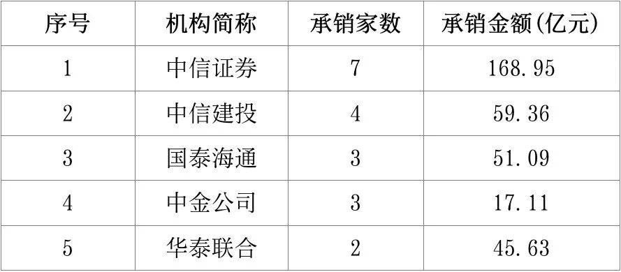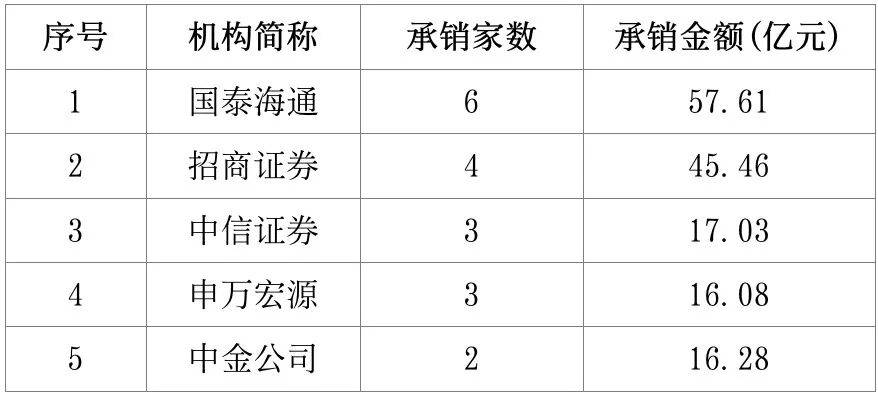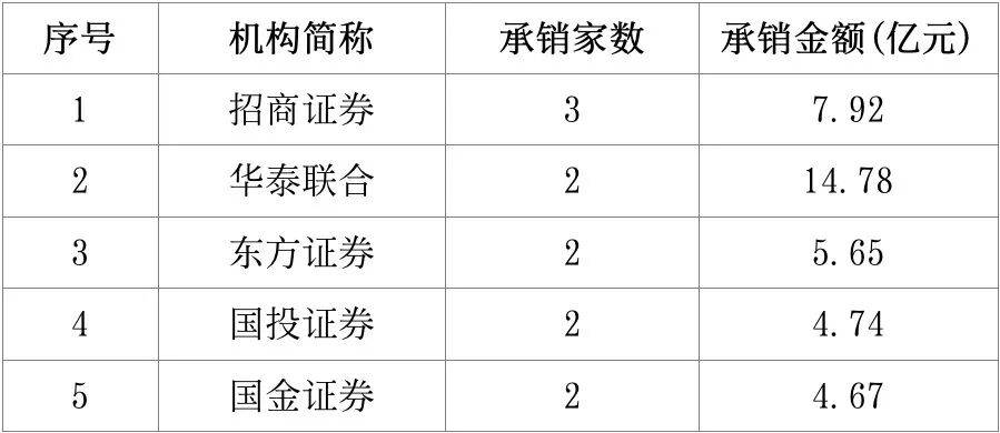 北交所持续深化服务创新型中小企业的核心定位,承销排名前五的券商依次为招商证券、华泰联合、东方证券、国投证券、国金证券。