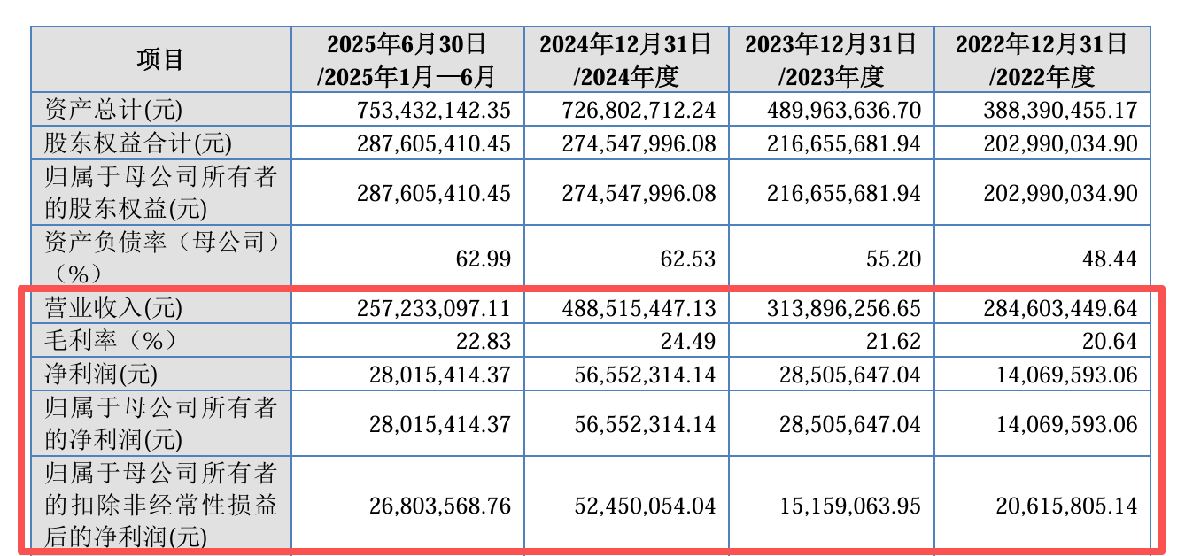 2022年至2024年及2025年上半年(下称“报告期”),公司营业收入分别为2.85亿元、3.14亿元、4.89亿元和2.57亿元;归母净利润分别为1406.96万元、2850.56万元、5655.23万元和2801.54万元。