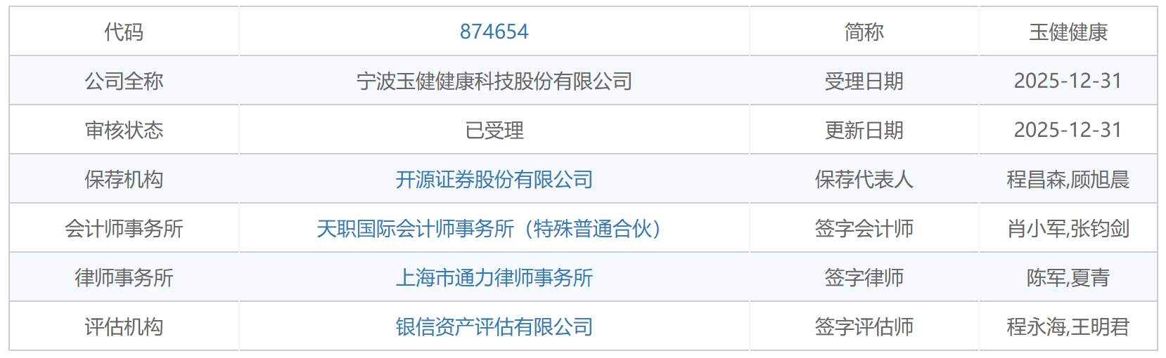 12月31日,据北交所官网,宁波玉健健康科技股份有限公司(下称“玉健健康”)IPO获得受理。该公司2025年度归母净利润面临下行压力,其65%的营业收入依赖北美地区的大客户,同时存货占总资产的比重较高。