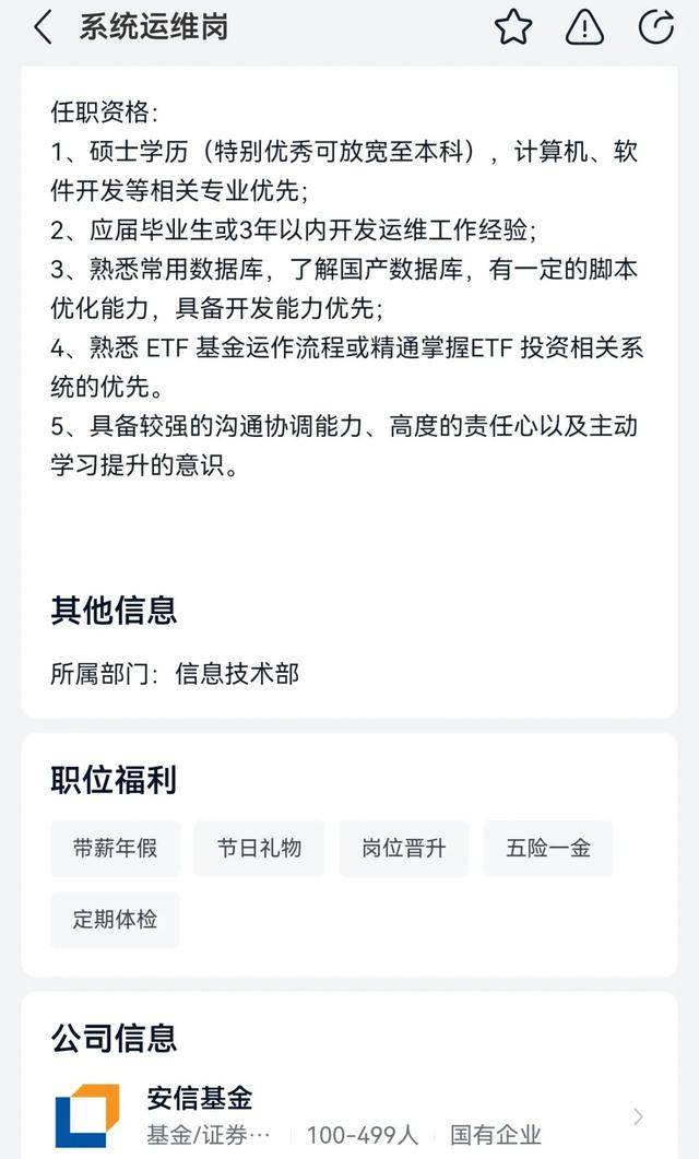 安信基金对外招聘的系统运维岗也倾向于招聘熟悉ETF运作流程或精通掌握ETF投资相关系统的人员。