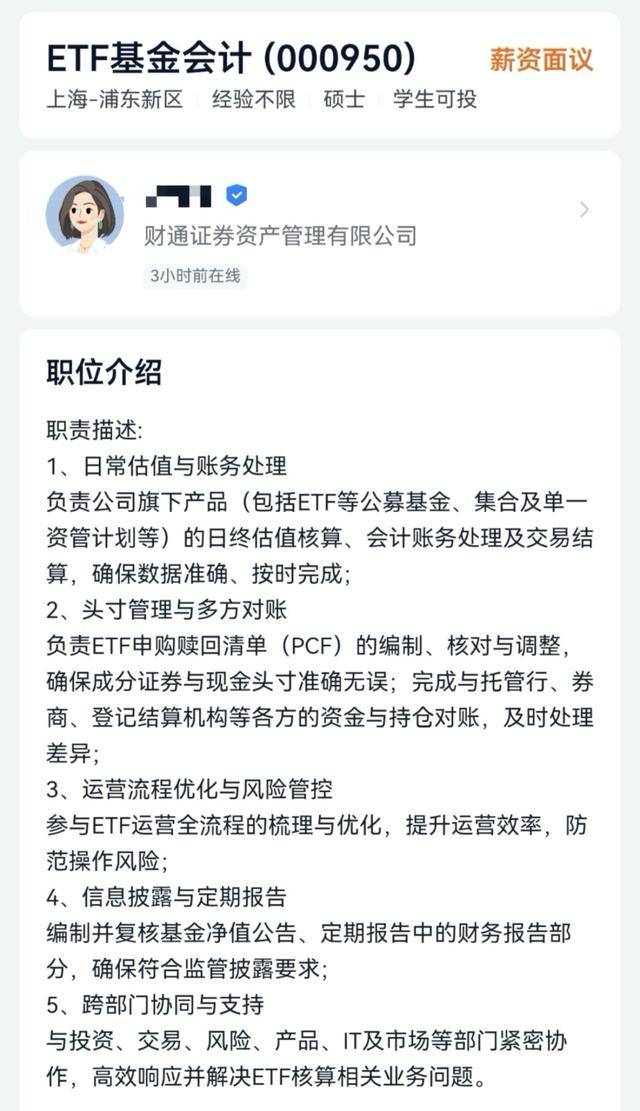 除了鹏安基金之外,另一家券商资管——财通证券资管也在为布局ETF市场招揽基金会计。某人才招聘App显示,ETF基金会计的日常工作包括负责公司旗下产品(包括ETF等公募基金,集合及单一资管计划等)的日终估值核算,会计账务处理交易结算,确保数据准确,按时完成,以及头寸管理与多方对账,负责ETF申购赎回清单(PCF)的编制,核对与调整确保成分证券与现金头寸准确无误等内容。