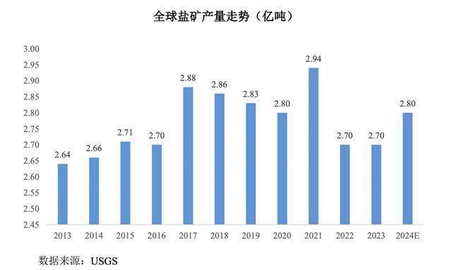 过去十余年,全球盐矿产量呈现整体稳定、小幅增长的趋势。根据美国地质调查局发布的数据,2024年全球盐矿产量预计为2.8亿吨。