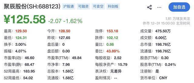 截至发稿时,聚辰股份A股报125.58元,总市值约198.76亿元。