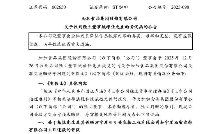 12月29日,加加食品发布公告称,于12月26日收到独立董事姚禄仕先生的督促函,要求董事长及关联方立即向公司还款,涉及金额达6700万元。
