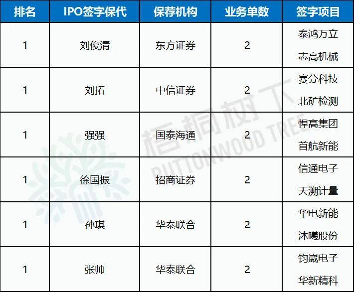 2025年A股IPO项目量最多的签字保代分别是东方证券的刘俊清、中信证券的刘拓、国泰海通的强强、招商证券的徐国振、华泰联合的孙琪及张帅。以上保代2025年项目单数均达到2单。