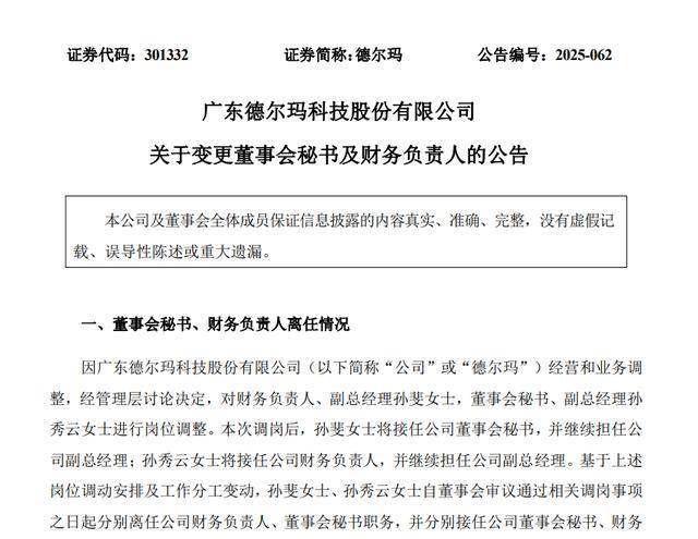 近日,德尔玛(301332.SZ)发布公告,因公司经营和业务调整,经管理层讨论决定,对财务负责人、副总经理孙斐,董事会秘书、副总经理孙秀云进行岗位调整。