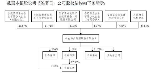 根据公司股权结构,直接持有公司5%以上股份的股东为清辉集电、长鑫集成、大基金二期、合肥集鑫及安徽省投,截至本招股说明书签署日,分别持有长鑫科技 21.67%.11.71%、8.73%、8.37%及7.91%的股权,不存在单一持股比例超过 50%的股东,公司的股权结构较为分散。