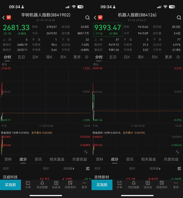 1月5日,宇树机器人指数(8841902)机器人指数(884126)盘初震荡调整。截至发稿,宇树机器人指数跌0.8%,机器人指数跌0.18%。
