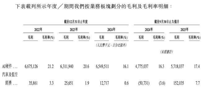 而公司的汽车及低空经济业务不仅营收规模较小,且曾一度处于亏本销售的状态。2025年前三季度,该业务实现收入为19.7亿元,营收占比为5.2%;该业务毛利率为7.7%,上一年同期为-3.6%。