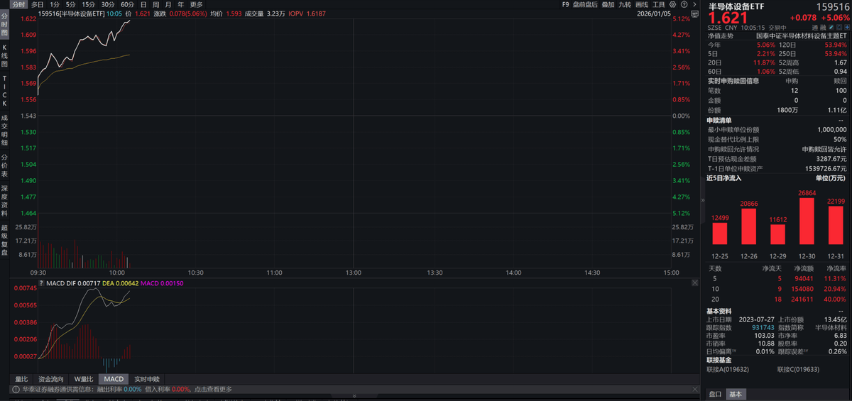 1月5日,受芯片产业多重利好催化,聚焦上游半导体设备领域的半导体设备ETF(159516)大涨超5%,资金持续抢筹,近20日净流入超24亿元,当前规模超90亿元,居同类产品第一。