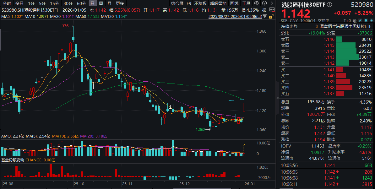 今日(1.5),港股科技吹响反攻号角,100%纯度的港股通科技30ETF(520980)大涨超5%,盘中成交额巨幅放量,现已超2.3亿元!资金面上,近10日有6日获净流入,累计“吸金”超2亿元!