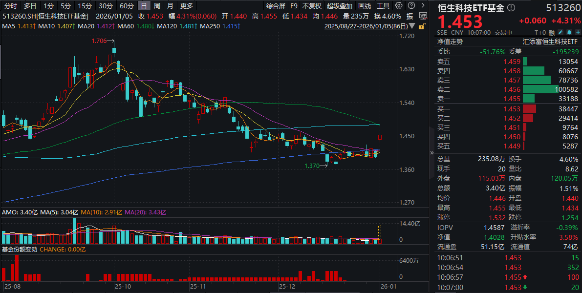 同类唯一15BP最低档管理费的恒生科技ETF基金(513260)亦涨超4%,盘中成交额已超3.4亿元。资金面上,近20日有13日获资金青睐,累计净流入超2.8亿元,基金最新融资余额超1.4亿元,最新规模达71.76亿元!