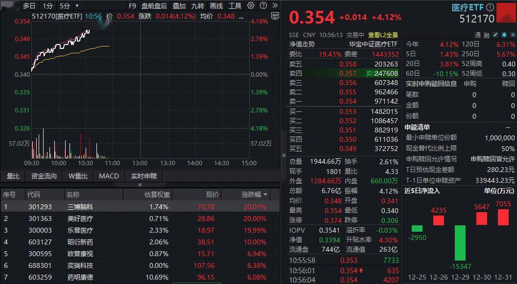 医疗ETF50只成份股全部上涨,脑机接口概念股集体爆发,三博脑科、美好医疗、乐普医疗20CM涨停!CXO亦强势,昭衍新药涨停,巨头药明康德涨近6%。
