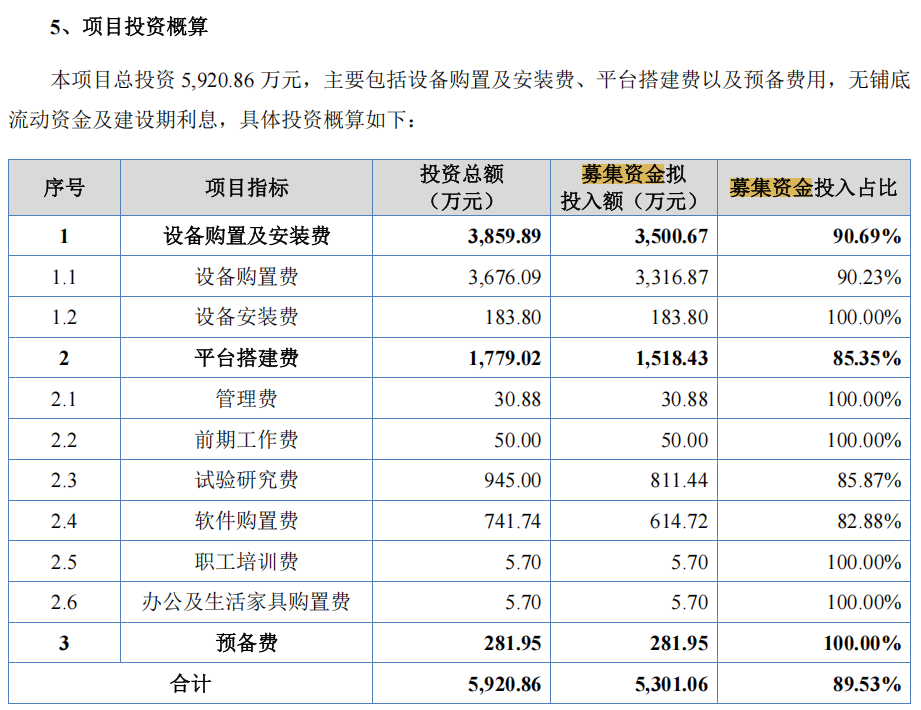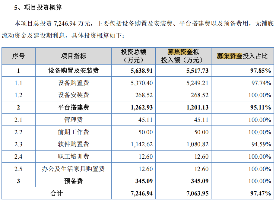 上述募投的项目中,有5517.73万元募集资金将用于设备购置及安装费,占该项目总募集资金的97.85%。