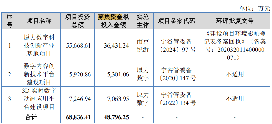 原力数字募投的第一个项目是原力数字科技创新产业基地项目,该项目建设主体为公司全资子公司南京锐游,建设地点位于江苏省南京市雨花台区锦华西B-2地块。公司拟投资55,668.61万元实施原力数字科技创新产业基地项目,一方面为扩充现有3D数字内容制作业务团队,积极引入高端制作人才、项目管理人员、核心研发人员,提升公司3D数字内容业务制作优势和交付能力;另一方面为建设办公场所以及购买开展业务所需的先进硬件设备和技术制作软件,以满足公司3D数字内容制作服务业务的发展需求,扩大市场份额,保持公司在国内3D 数字内容制作领域的优势地位。