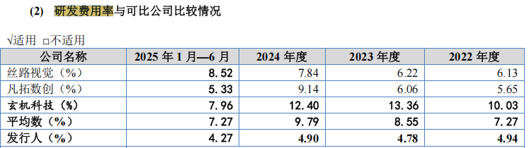 原力数字的研发费用率明显低于同行可比公司,报告期内,同行可比公司的研发费用率均值分别为7.27%、8.55%、9.79%和7.27%。