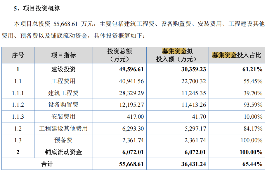 在上述项目的投资金额中,有3.06亿元募集资金用于建设投资,占总募集资金的61.21%,其中工程费用占比55.45%,安装费用占比10%。