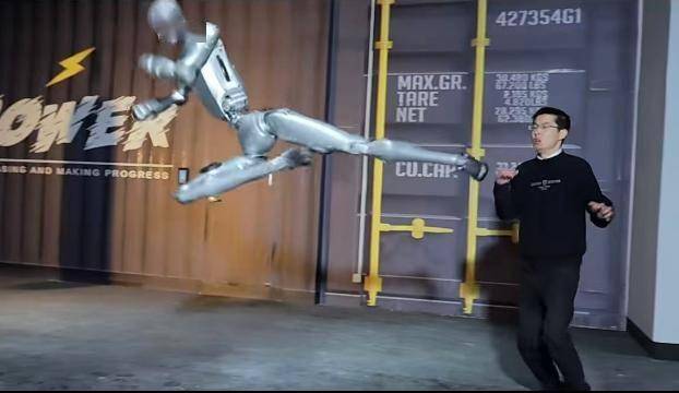 视频中,宇树机器人腾空侧踢吓退王兴兴,空中回旋踢将西瓜踢得粉碎。