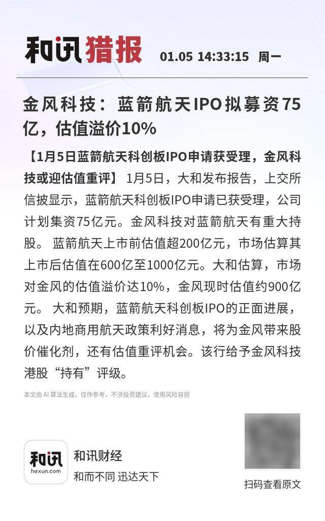 【1月5日蓝箭航天科创板IPO申请获受理,金风科技或迎估值重评】1月5日,大和发布报告,上交所信披显示,蓝箭航天科创板IPO申请已获受理,公司计划集资75亿元。金风科技对蓝箭航天有重大持股。 蓝箭航天上市前估值超200亿元,市场估算其上市后估值在600亿至1000亿元。大和估算,市场对金风的估值溢价达10%,金风现时估值约900亿元。 大和预期,蓝箭航天科创板IPO的正面进展,以及内地商用航天政策利好消息,将为金风带来股价催化剂,还有估值重评机会。该行给予金风科技港股“持有”评级。
