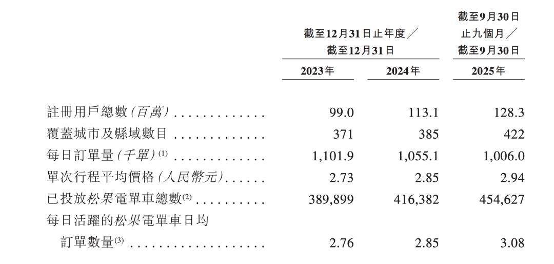 数据的停滞佐证了市场的担忧。纵向对比来看,2023年以来松果出行的营收增长已陷入停滞。2024年及2025年前九个月的营收几乎持平,维持在7.45亿元左右;更为严峻的是,其日均订单量在短短两年间蒸发了近10万单,从2023年的110.19万降至2025年前九个月的100.6万。即便公司试图通过提高客单价(从2.73元涨至2.94元)来对冲单量下滑,也无法掩盖下沉市场红利枯竭的事实。