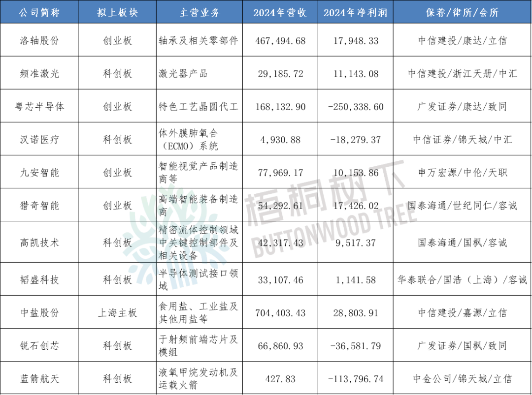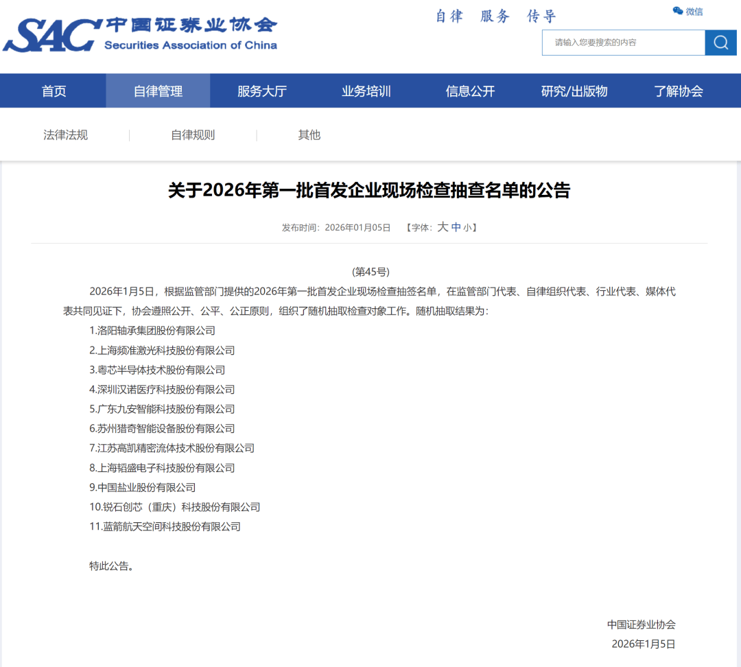 1月5日,中国证券业协会公布2026年第一批首发申请企业现场检查抽签名单。被抽到企业共11家,分别为洛阳轴承集团股份有限公司、上海频准激光科技股份有限公司、粤芯半导体技术股份有限公司、深圳汉诺医疗科技股份有限公司、广东九安智能科技股份有限公司、苏州猎奇智能设备股份有限公司、江苏高凯精密流体技术股份有限公司、上海韬盛电子科技股份有限公司、中国盐业股份有限公司、锐石创芯(重庆)科技股份有限公司、蓝箭航天空间科技股份有限公司。