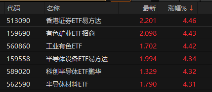 1月6日,ETF午间收盘涨跌不一,香港证券ETF易方达(513090)领涨4.46%,有色矿业ETF招商(159690)涨4.43%,工业有色ETF(560860)涨4.42%,银行AH优选ETF(517900)领跌2.22%,标普生物科技ETF(159502)跌2.11%,纳指生物科技ETF(513290)跌1.6%。