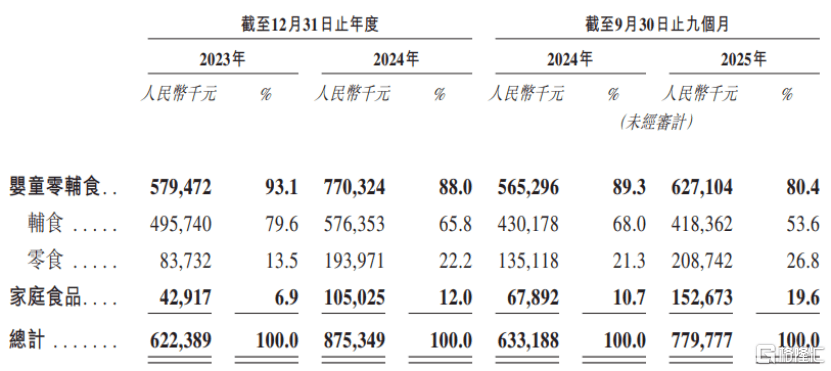 具体来看,2023年、2024年和2025年1-9月(简称“报告期”),爷爷的农场来自婴童零辅食的收入占比有所下降,但仍在80%以上;家庭食品的收入占比从6.9%提升至19.6%。