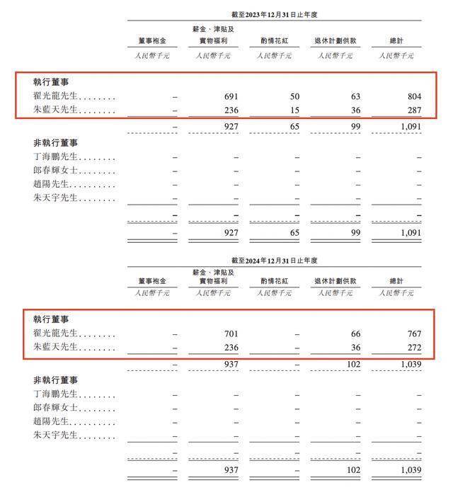 薪酬方面,2023年、2024年,翟光龙薪酬分别为80.4万元、76.7万元,朱蓝天薪酬分别为28.7万元、27.2万元。2024年薪酬均有出现下滑。