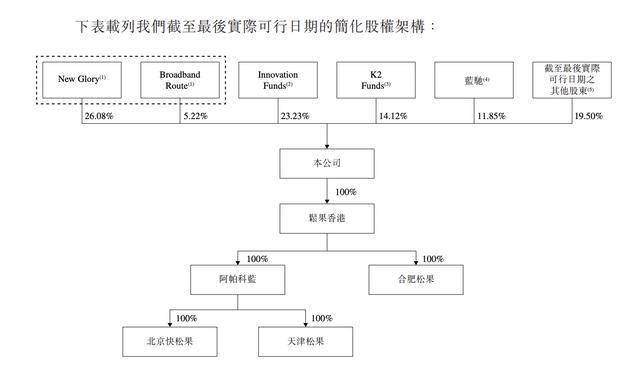 IPO前,翟光龙、朱蓝天、New Glory、Humble Voyage及BroadbandRoute被视为松果出行的控股股东集团,合计持有公司已发行股份总数的约31.30%。
