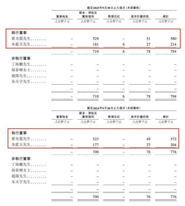 时间来到2025年前9月,翟光龙、朱蓝天薪酬分别为58万元、21.4万元,较上年同期分别增加1.4%、4.9%。