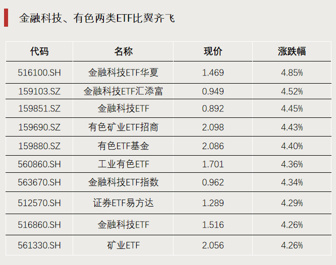 今日,A股、港股大金融板块集体大涨,金融科技行业ETF同步走强。同时,隔夜贵金属、有色金属价格上扬,推动有色类ETF强势攀升。