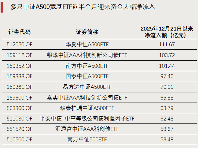 最新监测数据显示,自2025年12月21日至2026年1月5日的半个月内,中证A500宽基ETF迎来资金大幅净流入,多只ETF产品吸金规模超100亿元。