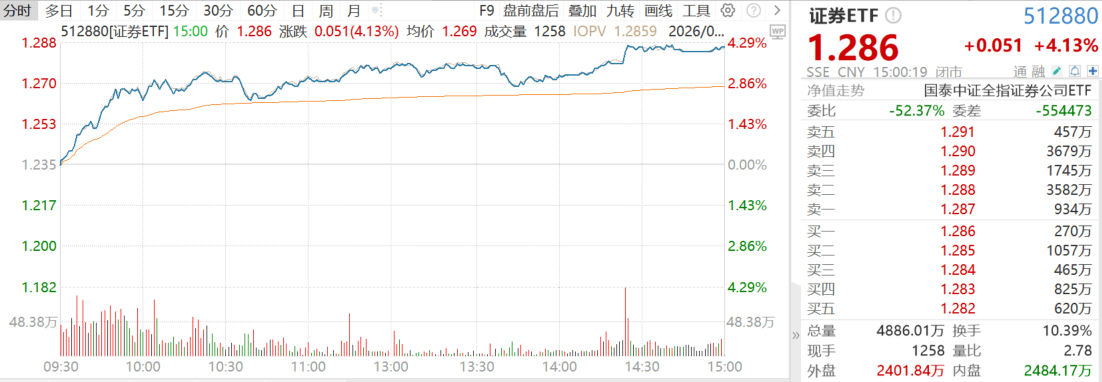 “牛市旗手”大涨虽迟但到,证券ETF大涨4.13%点评