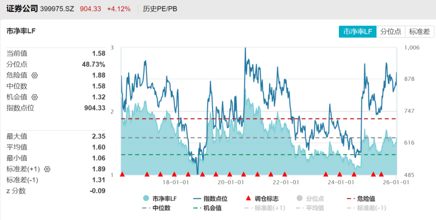 根据中信建投证券统计,42家上市券商为样本统计历史数据2012年以来,当上市券商年化ROE处于7%~8%区间时,证券指数PB估值通常在1.75~2倍(预期次年ROE上行时靠近上沿,反之靠下沿)。2025年前三季度上市券商年化ROE已达7.1%,对应PB估值在8月峰值仅1.6倍、三季度末1.47倍、12月31日1.39倍,显著低于历史同ROE水平的估值区间,存在明显修复空间。
