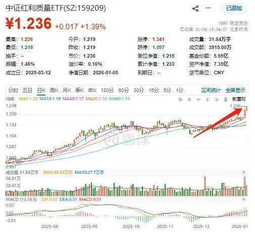 1月6日,两市全面大涨。截至收盘,“高质量红利”中证红利质量ETF(159209)收涨1.39%,盘中创上市以来51次新高!成交额约3900万,资金热度不减,据Wind Level2实时行情结合均价预估,盘中净流入超1300万,截至发稿,该基金获资金连续15日净流入,累计约1.6亿!
