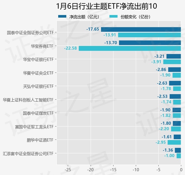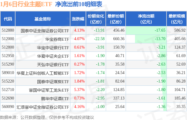 当日有179只行业主题ETF基金出现资金净流出,其中净流出排首位的是国泰中证全指证券公司ETF(512880),份额减少了13.91亿份,净流出额为17.65亿元。