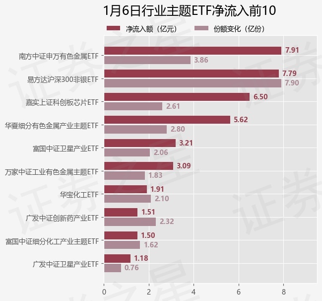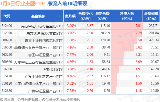 当日有78只行业主题ETF基金出现资金净流入,其中净流入排首位的是南方中证申万有色金属ETF(512400),份额增加了3.87亿份,净流入额为7.91亿元。