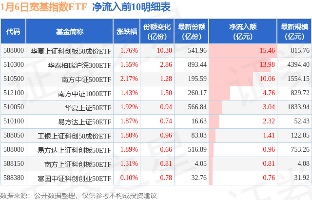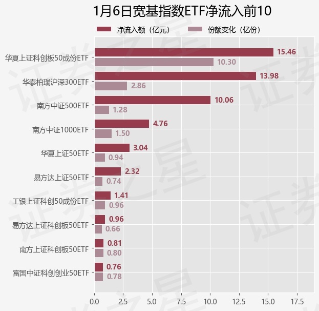 当日有36只宽基指数ETF基金出现资金净流入,其中净流入排首位的是华夏上证科创板50成份ETF(588000),份额增加了10.3亿份,净流入额为15.46亿元。