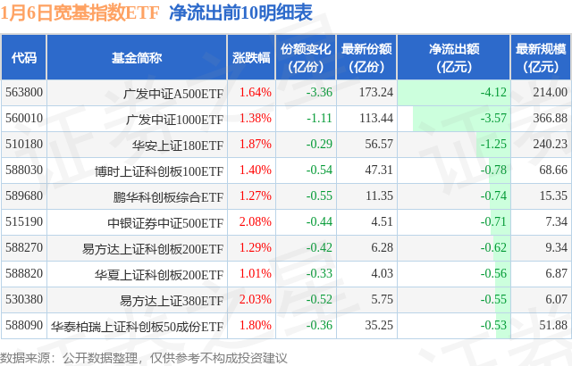 当日有84只宽基指数ETF基金出现资金净流出,其中净流出排首位的是广发中证A500ETF(563800),份额减少了3.36亿份,净流出额为4.12亿元。