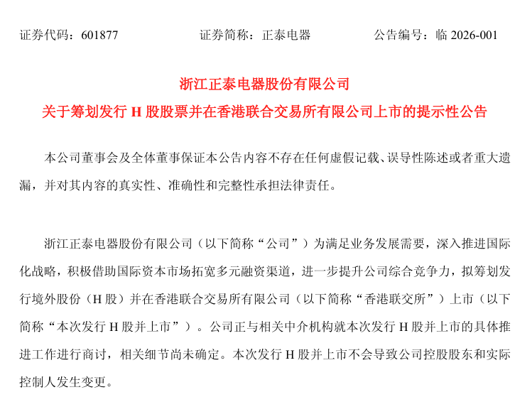 北极星储能网获悉,1月6日晚,正泰电器公告称,为满足业务发展需要,深入推进国际化战略,积极借助国际资本市场拓宽多元融资渠道,进一步提升公司综合竞争力,拟筹划发行境外股份(H股)并在香港联合交易所有限公司(以下简称“香港联交所”)上市(以下简称“本次发行H股并上市”)。正泰电器表示,公司正与相关中介机构就本次发行H股并上市的具体推进工作进行商讨,相关细节尚未确定。