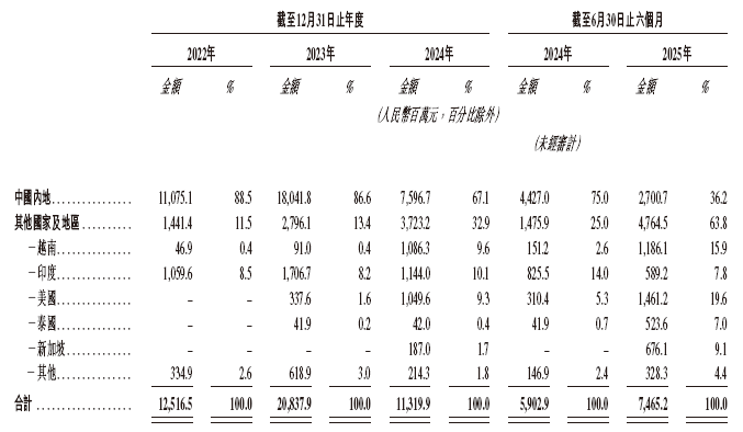 2022年至2024年及2025年上半年,来自中国内地市场的收入占总收入的比重分别为88.5%、86.6%、67.1%、36.2%;来自其他国家及地区实现的收入占总收入的比重则从11.5%提升至63.8%。