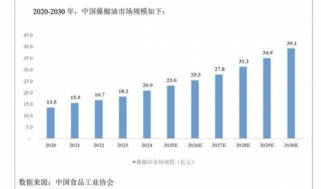 作为花椒油的细分品类,藤椒油产品口味普适性更强,“清、香、鲜、麻”的特性更具味觉记忆,因此近年来藤椒油及相关应用快速渗透,细分市场规模快速成长。根据中国食品工业协会的调研统计,2024年中国藤椒油市场的出厂口径销售规模约为20.9亿元,中国藤椒油市场规模的整体增速相较花椒油更高,预计藤椒油市场规模将在2027年成长至27.8亿元,并将在2030年达到39.1亿元。