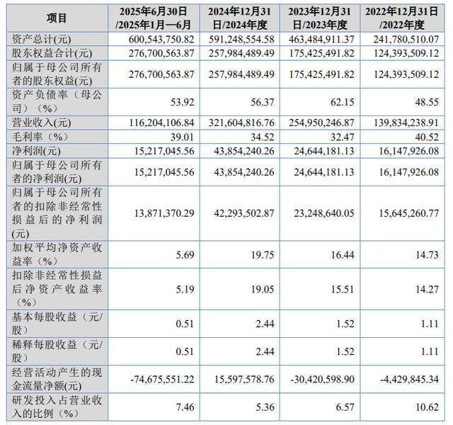 业绩方面,2022年至2024年及2025年上半年(报告期各期),公司的营业收入分别为1.40亿元、2.55亿元、3.22亿元和1.16亿元,2023年度和2024年度分别较上年增长82.32%和26.14%,呈高速增长态势;净利润分别为1614.79万元、2464.42万元、4385.42万元和1521.70万元