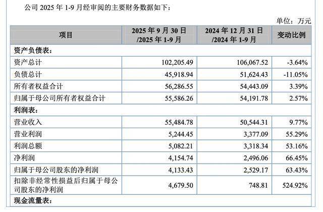 2025年1-9月,公司实现营收为5.55亿元,同比增长9.77%;归母净利润为4133.43万元,同比增长63.43%。