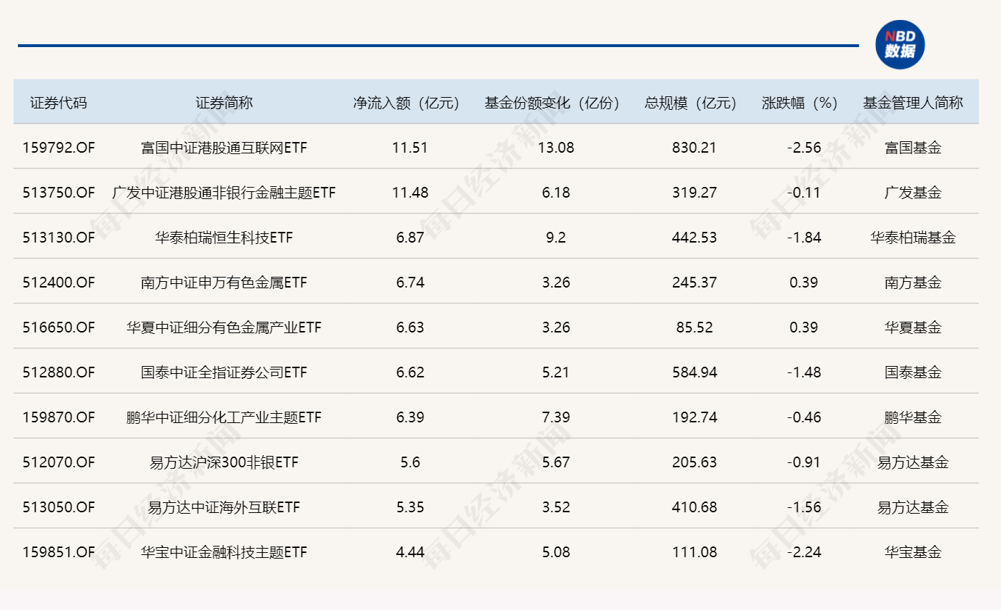 Wind数据显示,在1月7日的非货币ETF市场中,富国中证港股通互联网ETF份额增加13.08亿份,净流入额11.51亿元;广发中证港股通非银行金融主题ETF份额增加6.18亿份,净流入额11.48亿元;华泰柏瑞恒生科技ETF份额增加9.20亿份,净流入额6.87亿元。