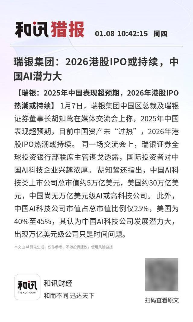【瑞银:2025年中国表现超预期,2026年港股IPO热潮或持续】1月7日,瑞银集团中国区总裁及瑞银证券董事长胡知鸷在媒体交流会上称,2025年中国表现超预期,目前中国资产未“过热”,2026年港股IPO热潮或持续。 同一场交流会上,瑞银证券全球投资银行部联席主管谌戈透露,国际投资者对中国AI科技企业兴趣浓厚。 胡知鸷还指出,中国AI科技类上市公司总市值约5万亿美元,美国约30万亿美元,中国尚无万亿美元级AI或高科技公司。 此外,中国AI科技公司市值占总市值比例仅25%,美国为40%至45%,其认为中国AI科技公司发展潜力大,出现万亿美元级公司只是时间问题。