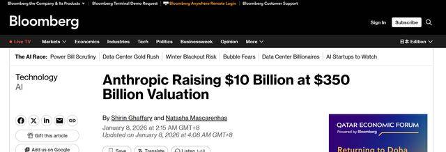 【环球网科技综合报道】1月8日消息,据彭博社报道,人工智能领域知名企业Anthropic近日传出新一轮融资计划,拟以3500亿美元的估值筹集100亿美元资金。此举被业内解读为该公司为后续可能启动的首次公开募股(IPO)进行蓄力。